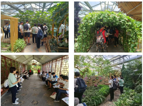 研学活动注重学习和体验,通过参观学习、交流互动等方式帮助学生们深入了解所学的学科、文化、自然等,从而提高知识水平,拓宽视野。本次活动分为温室和室外花园参观学习两部分,温室内种植的植物涵盖全国各个地区大气候带,如热带季风气候的香蕉,温带季风气候的龙牙花等等;室外种植的是北温带半湿润大陆性季风气候下的常见植物。