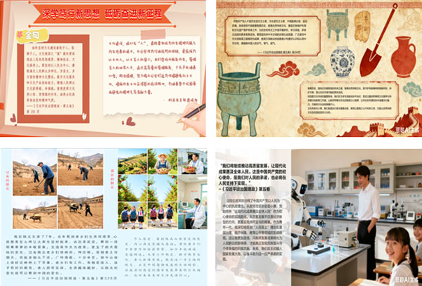 本次活动突破传统学习模式,将理论学习与人工智能技术进行融合,开创“智慧学习”新模式,创新设置了四大创作板块:“金句品读·手账创意分享”“金句溯源·历史场景还原”“金句绘境·AI绘画创作”及“金句物语·日常生活联想”四大创意板块。参与活动的党员群众选取《习近平谈治国理政·第五卷》中的经典论述,或精心制作图文并茂的学习手账,或巧妙构思展现古今对比的对话图景,或运用AI技术可视化呈现教育强国蓝图,或通过日常影像捕捉诠释“人民对美好生活的向往”。这种创新的学习方式突破了传统文本学习的局限,让抽象的理论变得可感可知。教师们在使用AI技术进行创作的过程中,体验了科技赋能教育的魅力,在人机互动中深化了对“加快建设教育强国”“科技自立自强”等重要论述的理解。